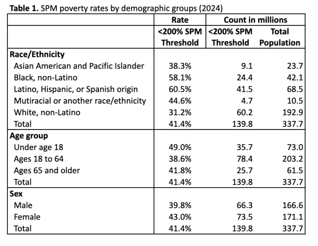 Although a broader and preferred measure, the SPM poverty threshold still remains an incomplete estimate of poverty. For instance, according to the SPM, a four-person household with an income of $40,000 is not poor because they fall above the designated poverty threshold. This means that many households living just above the poverty threshold aren’t counted as poor, even though they will have an incredibly hard time meeting their basic needs.